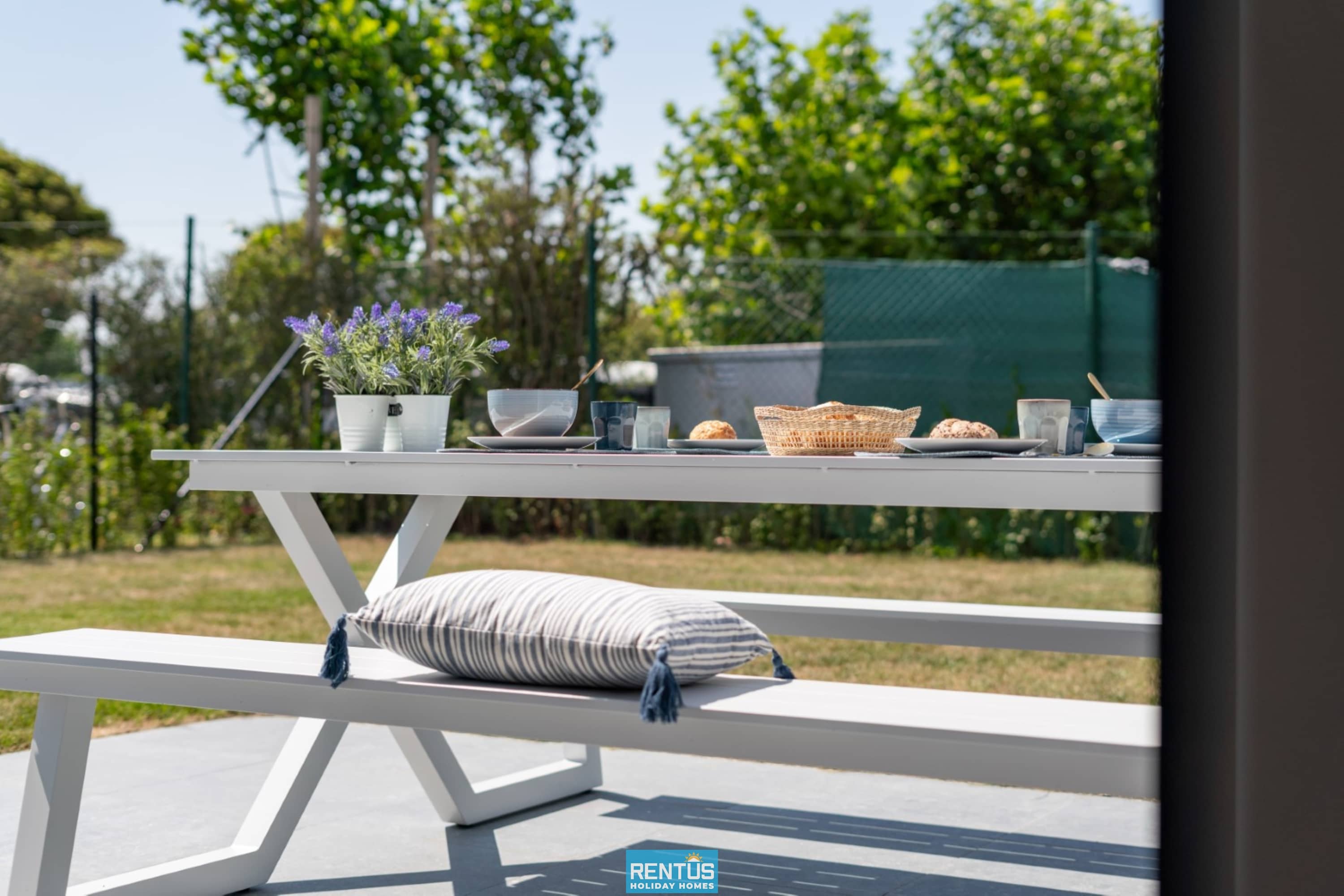 Bij aankomst komt u meteen terecht in de ruime open keuken en woonkamer. De keuken is uitgerust met een vaatwasmachine, microgolfoven en oven. De aangrenzende woonkamer biedt voldoende ruimte om te ‘loungen’ en te ontspannen na een dag op strand!Vanuit de woonkamer heeft u directe toegang tot de ruime tuin, waar u gebruik kunt maken van de tuinmeubelen. Ideaal voor de kids!